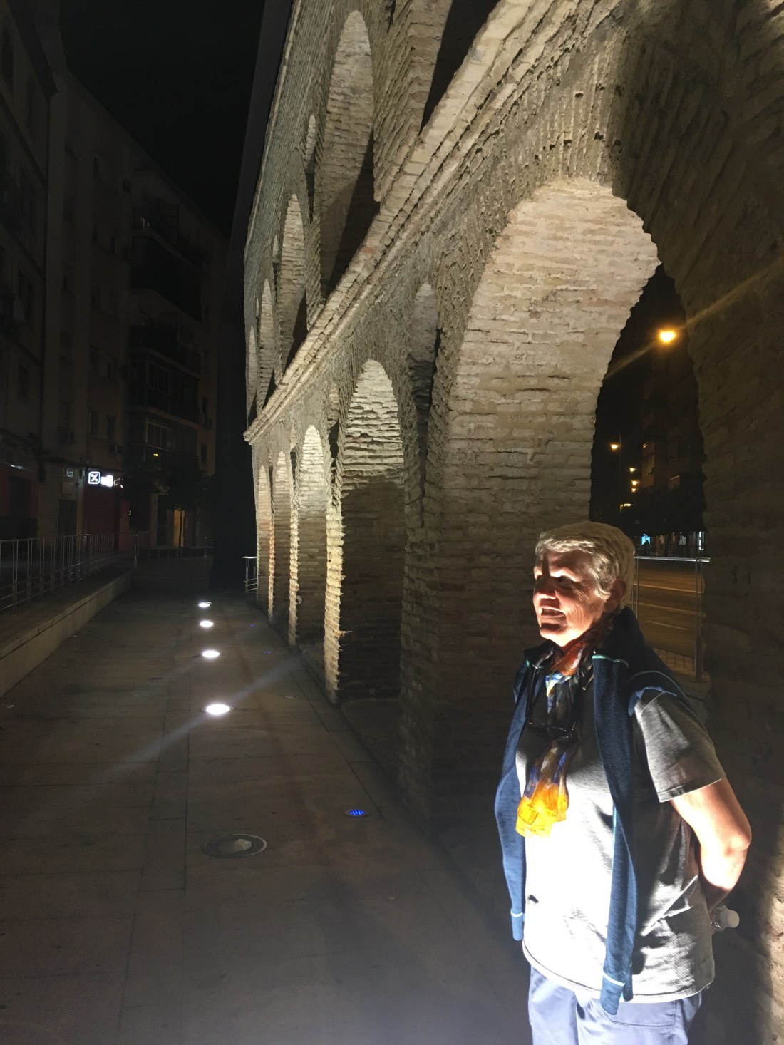 Sections of the arched wall remain right next to the sidewalk & roadway & lights up beautifully.