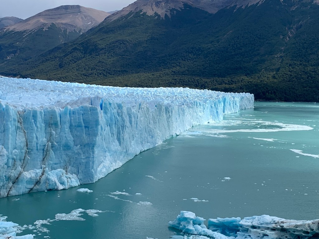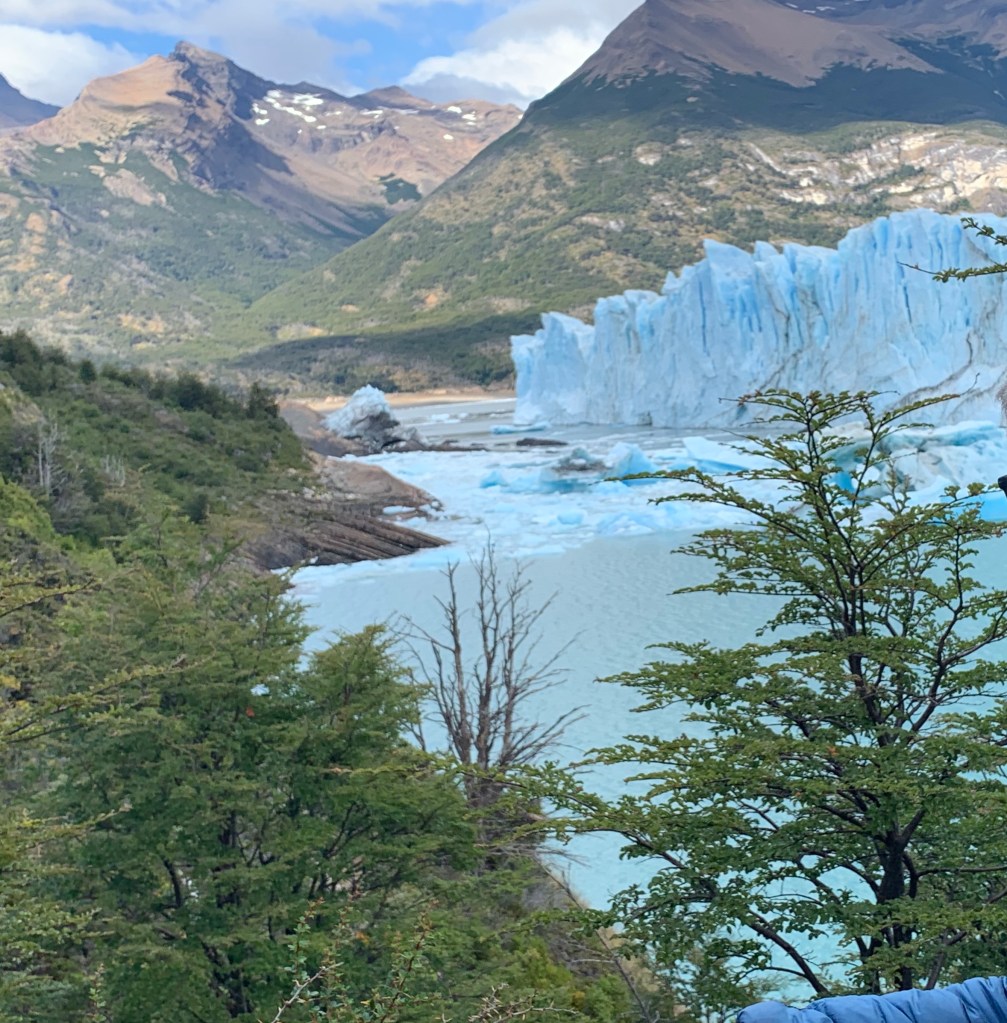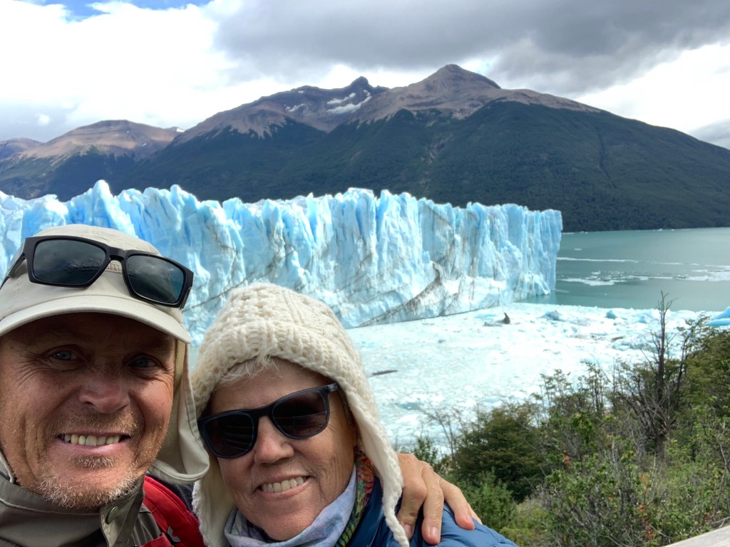 It is tough to leave Chile & Torres del Paine & we will be back! Now it is on to El Calafate & Perito Moreno glacier. We head there via a 6 hour bus ride. Pleasant, timely, clean, inexpensive- all good! It is wArmer in El Calafate& it is a tourist town with lots of shops, cafes, restaurants & chocolate shops. The Perito Moreno glacier is huge, growing, calving, & we can get close! We spend 5 hours watching it!