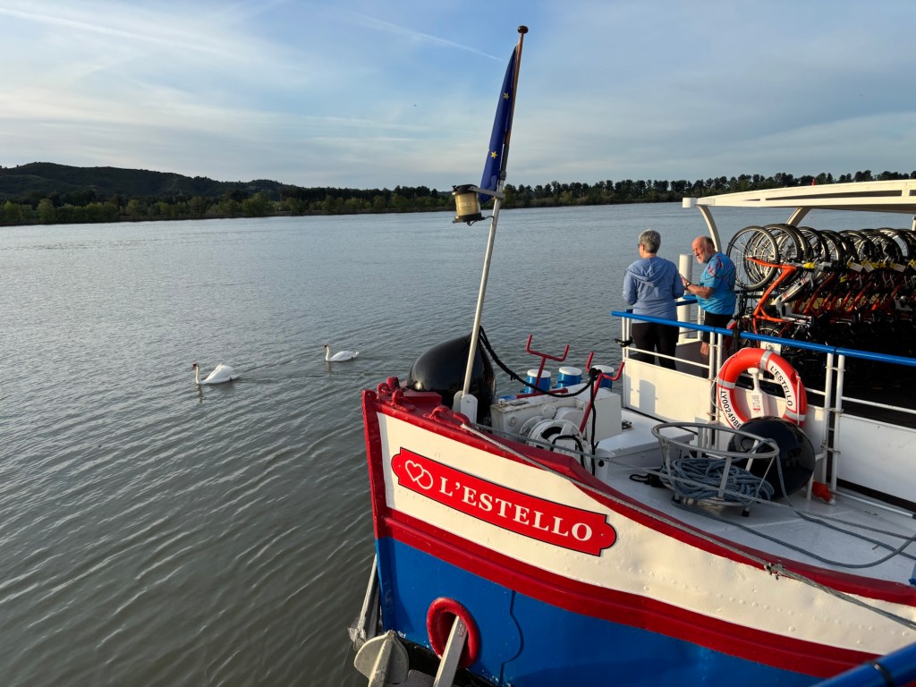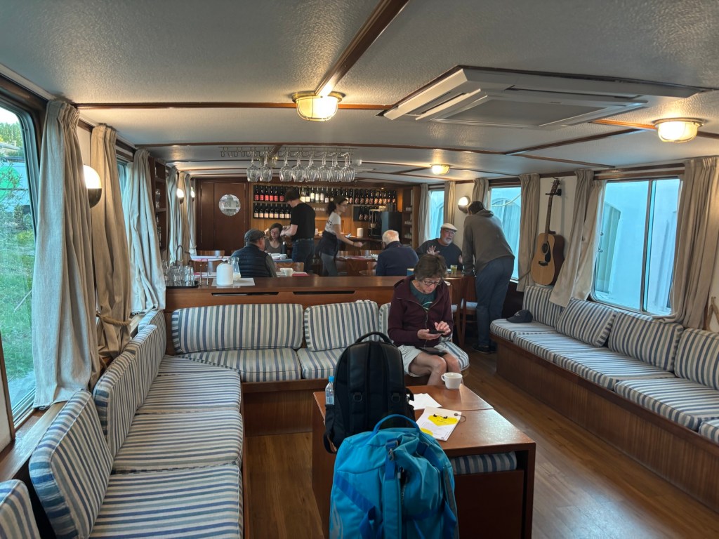 Upstairs dining & living – cozy. Nice outdoor space at bow. Getting acquainted with fellow travellers – very fun & interesting. Bikes nice and follow the leader touting easy. Love my ebike!