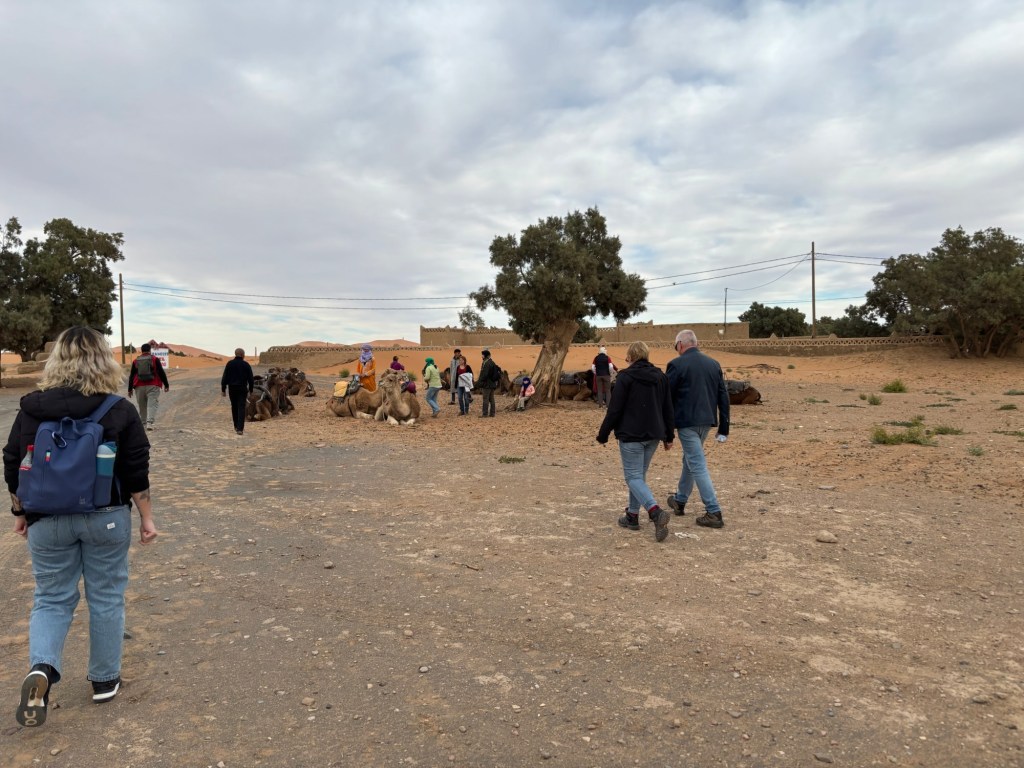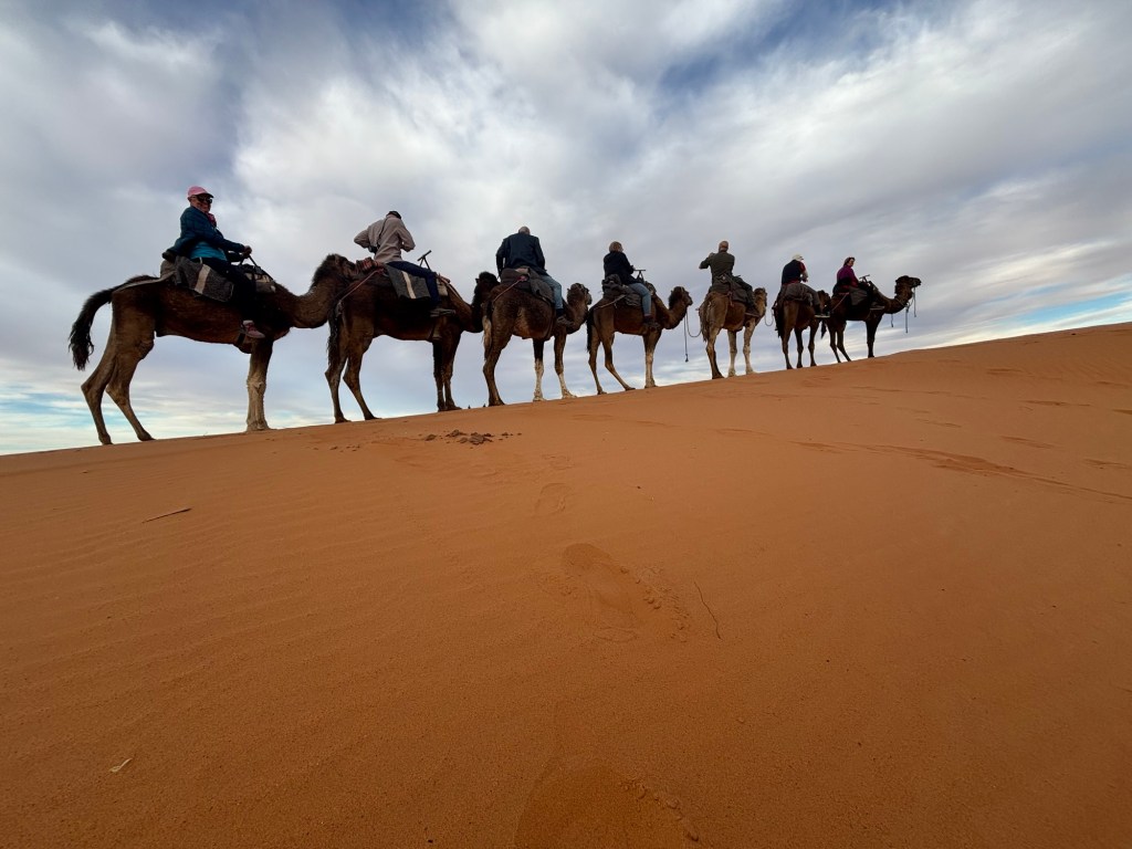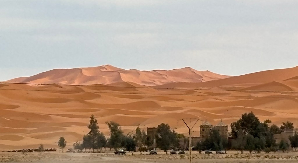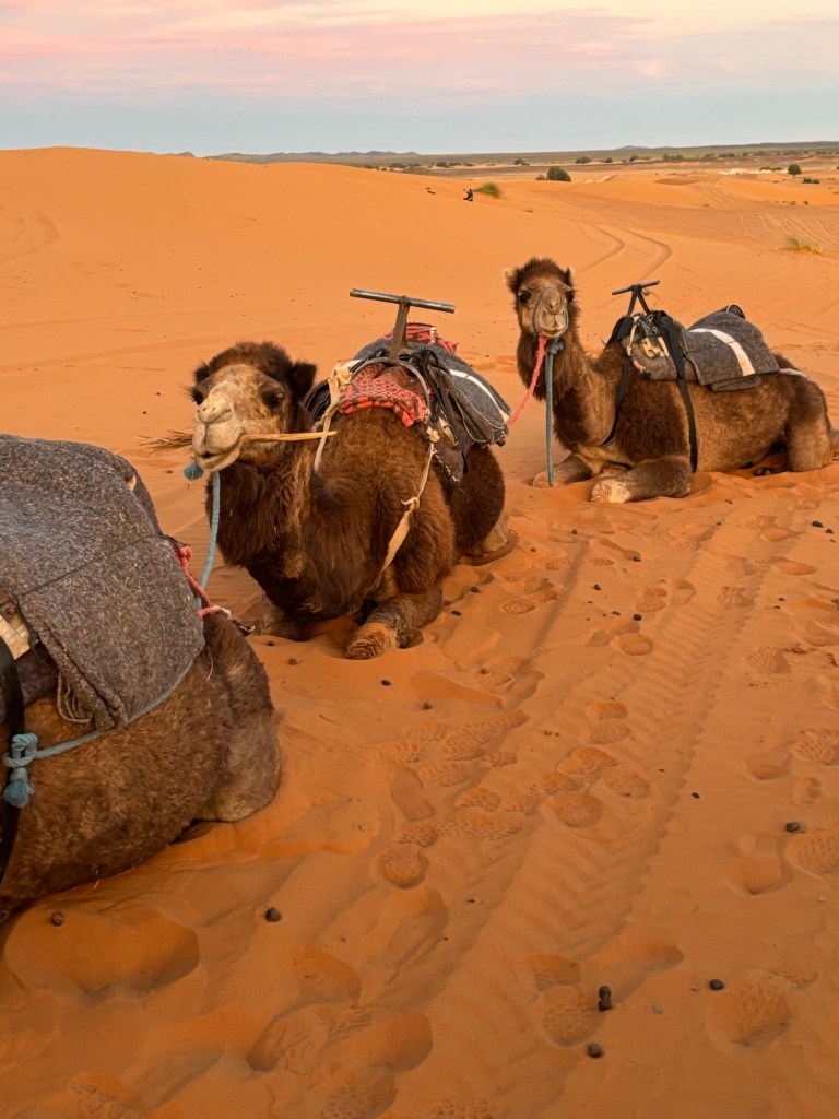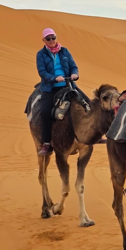 Our group has explored some great places while on the road in Morocco. We have travelled along the Atlantic Ocean from Casablanca to Tangiers. Then started to explore the mountains from Tangiers to Chefchaouen(blue city.) and then travelled through more mountains enroute to the Sahara Desert. There is a river which provides water for Date Palm groves. And irrigation for crops. And then there is the desert. It really looks like the scenes from Lawrence of Arabia. We rode camels to an overnight camp in the desert and experienced amazing sunset& sun rise- along with a very cool 1.5 hour camel ride.