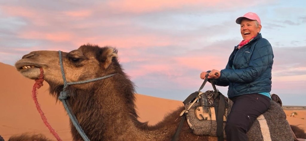 The natural light at sunrise in Sahara is magical. We were so fortunate to have good weather & be able to ride camels thru the desert. The sand dunes formations – fabulous!
