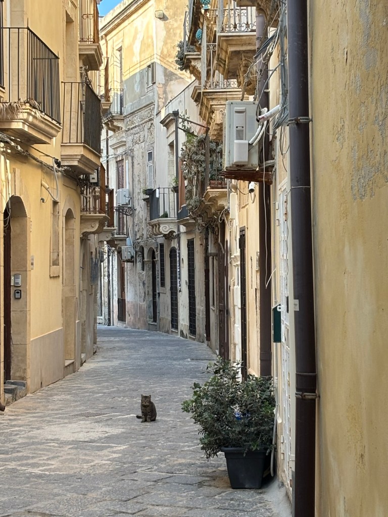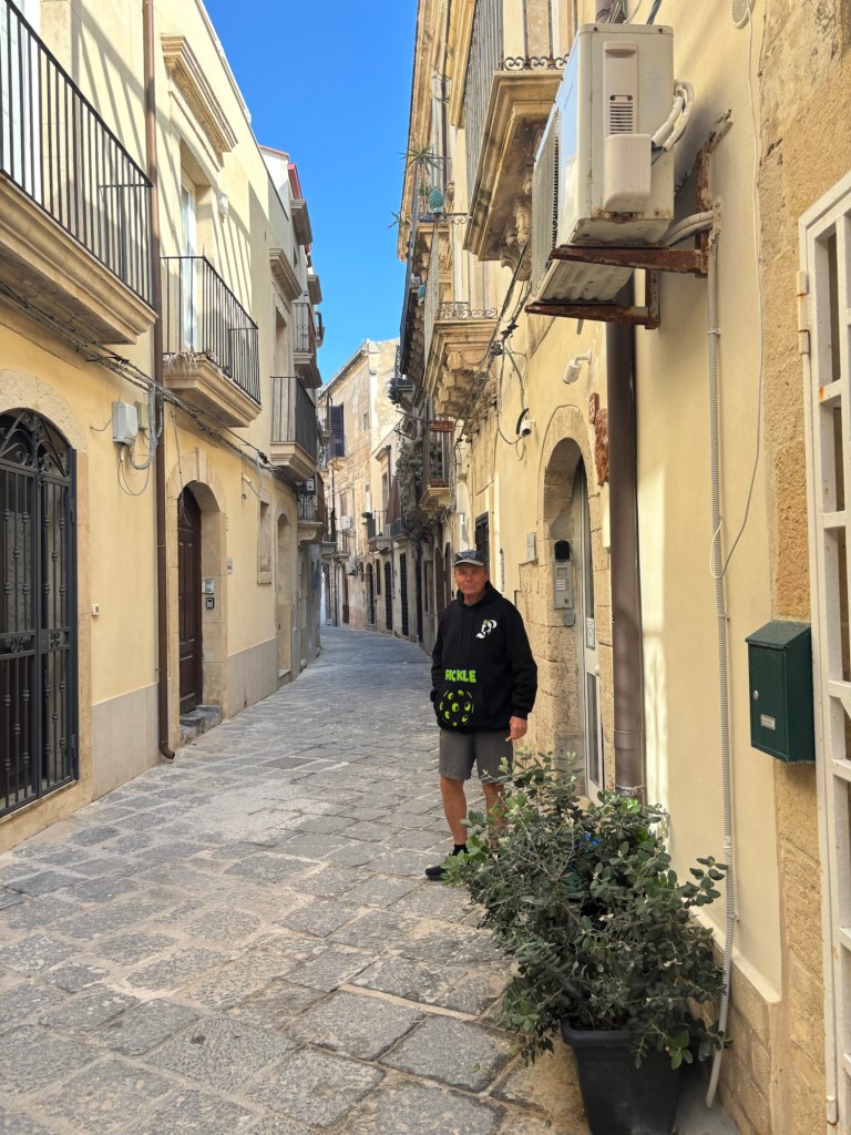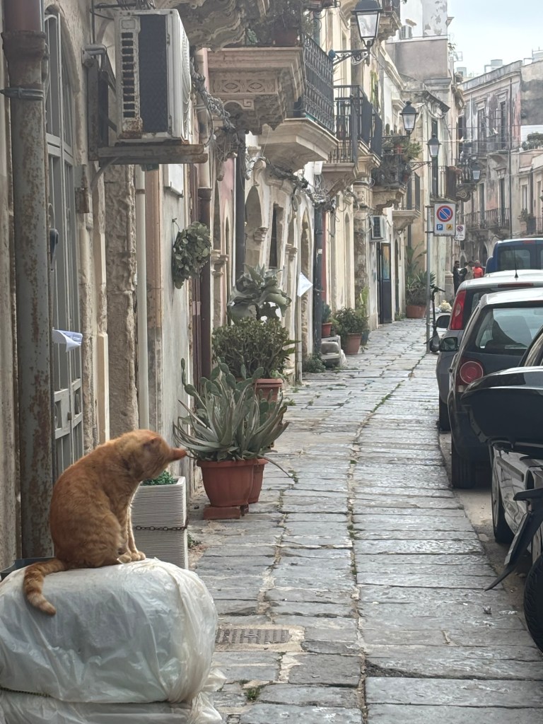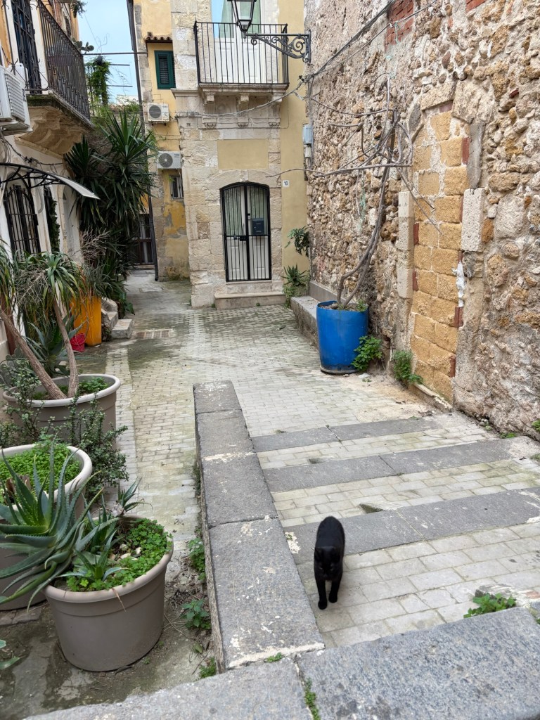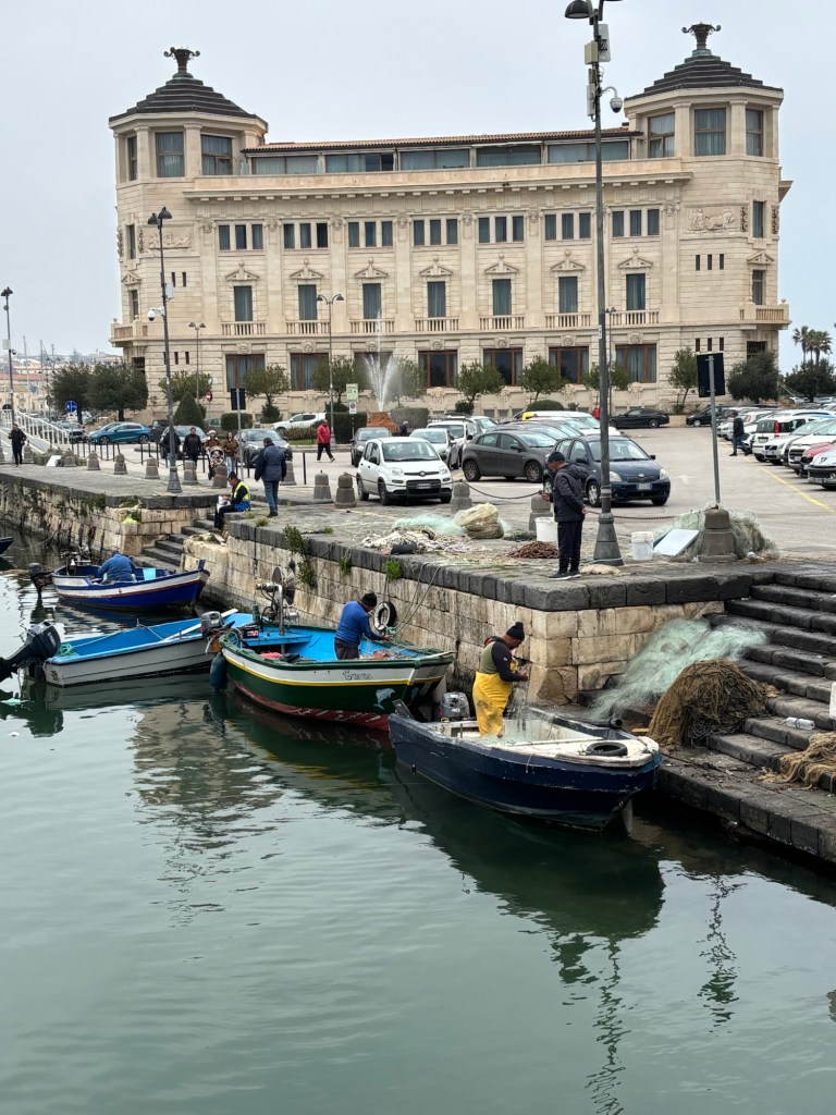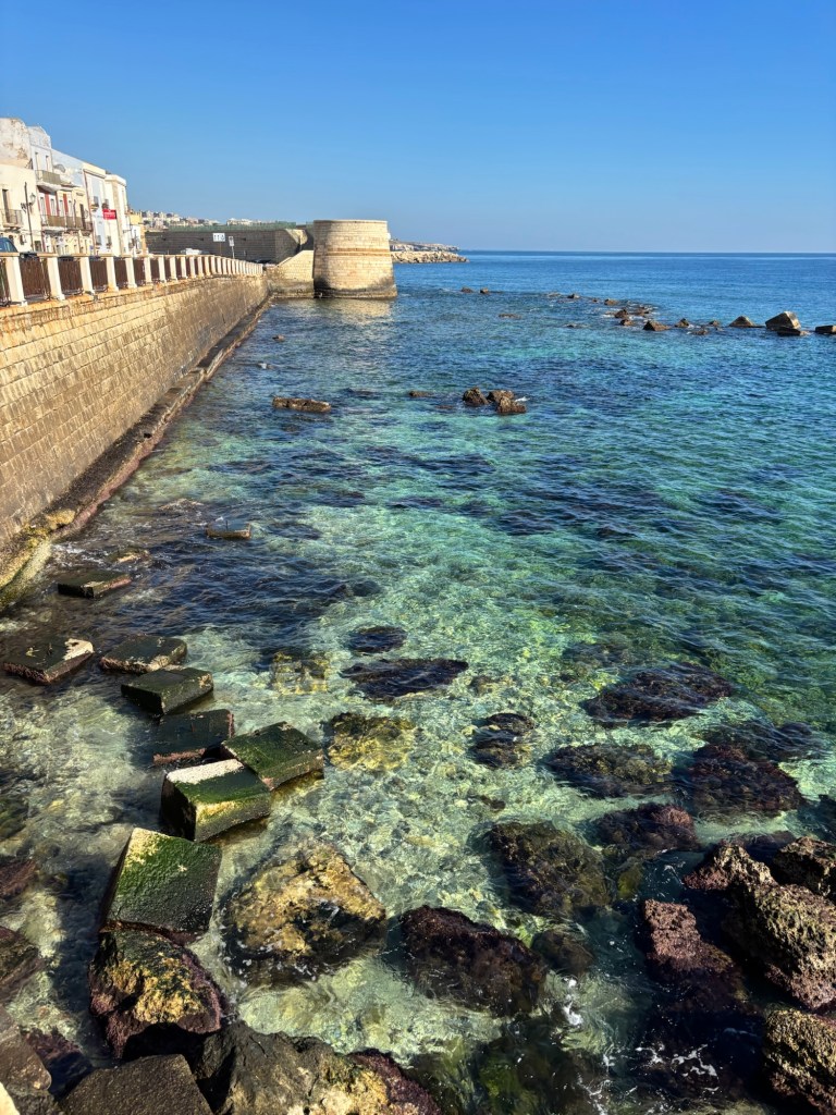 We continue to be charmed by Ortigia. The shoreline stunning. We see lots of fish swimming in crystal clear water. The streets winding through ancient buildings- stunning. Fishermen cleaning their nets after a day at sea.