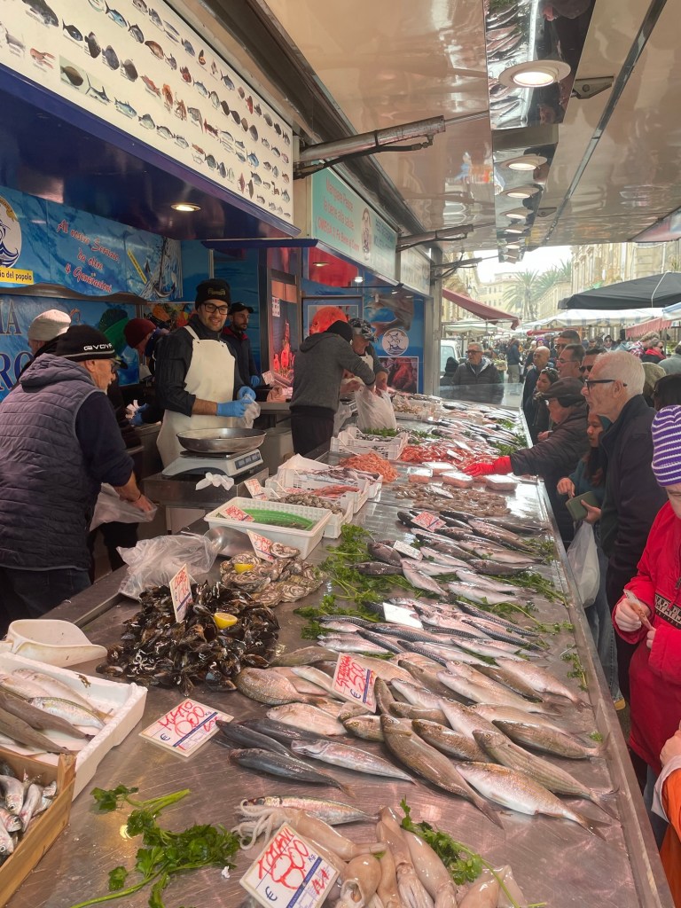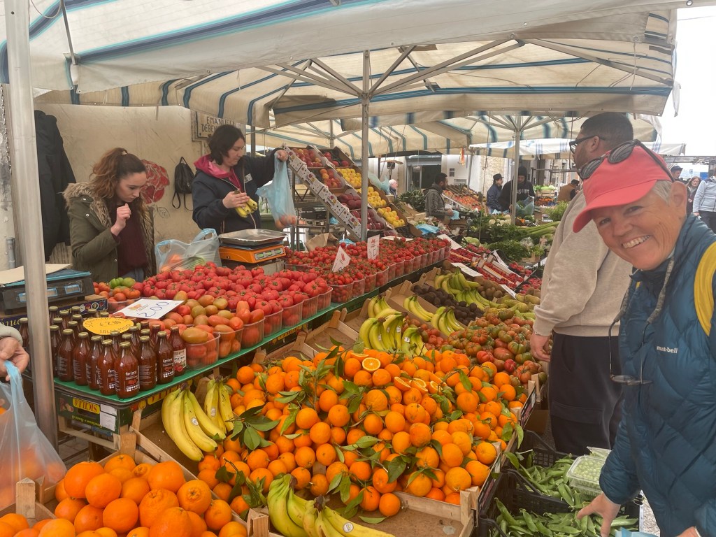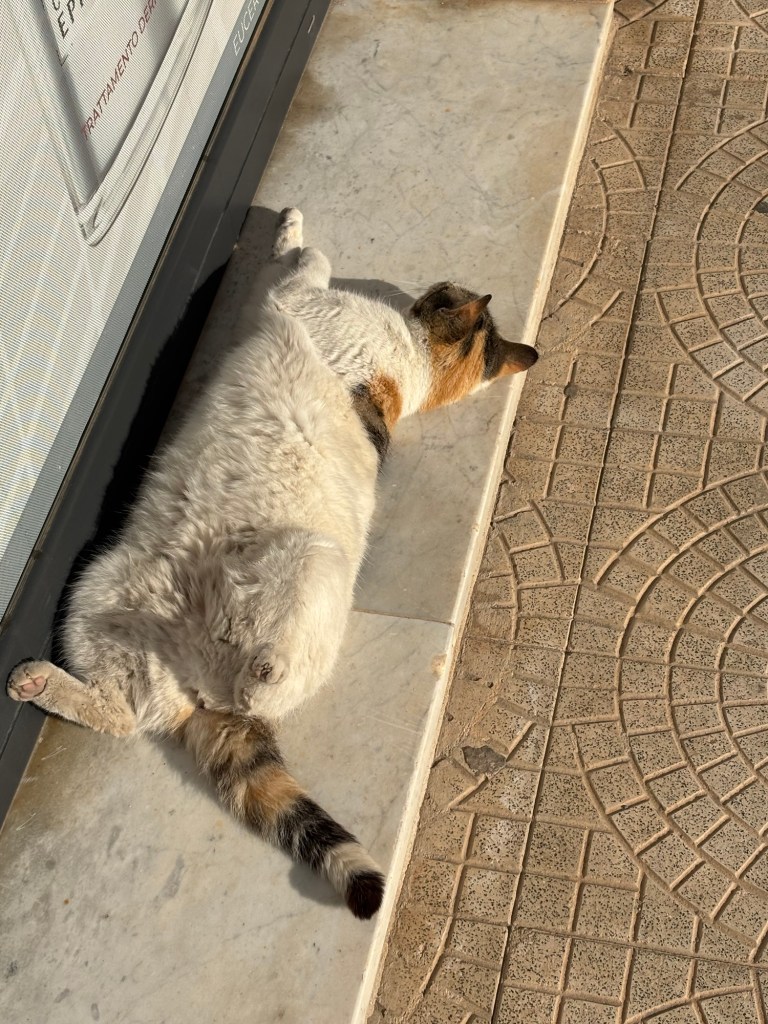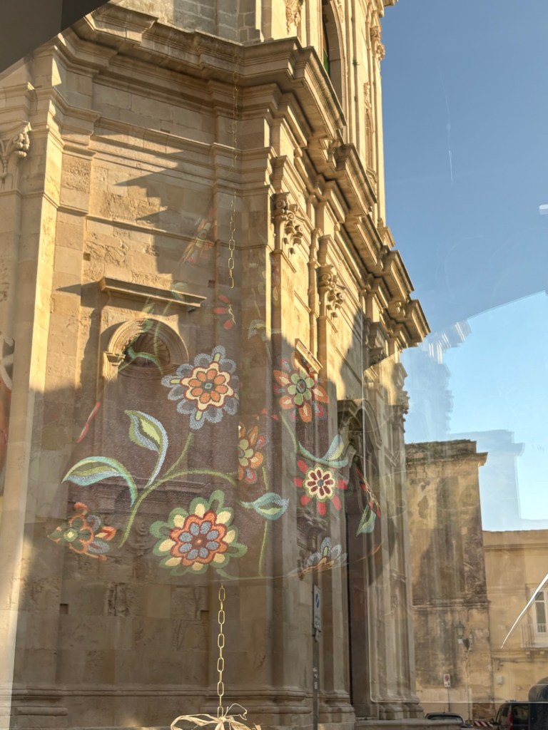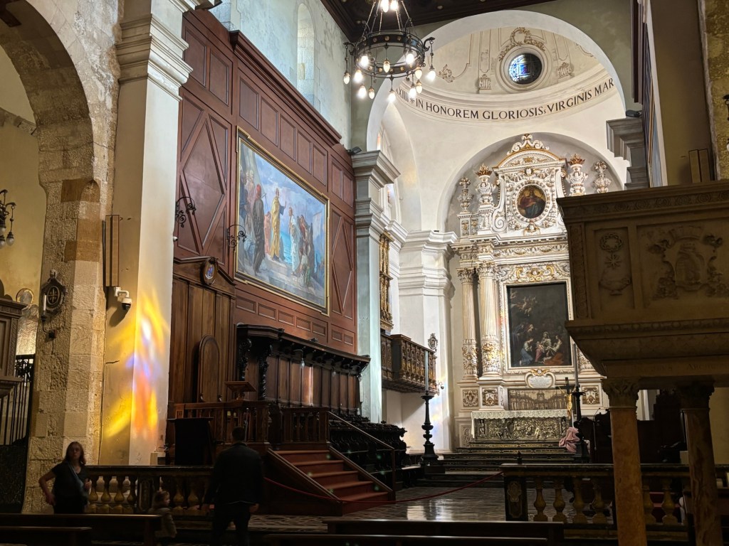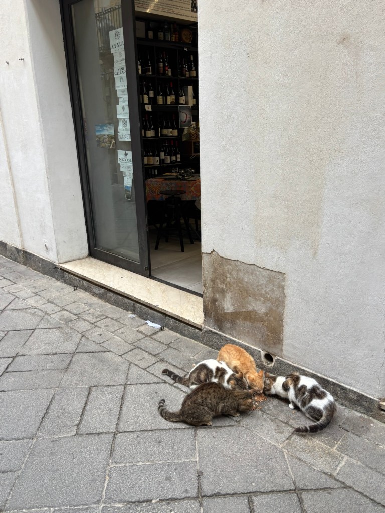 We continue to be charmed by Ortigia. The shoreline stunning. We see lots of fish swimming in crystal clear water. The streets winding through ancient buildings- stunning. Fishermen cleaning their nets after a day at sea.