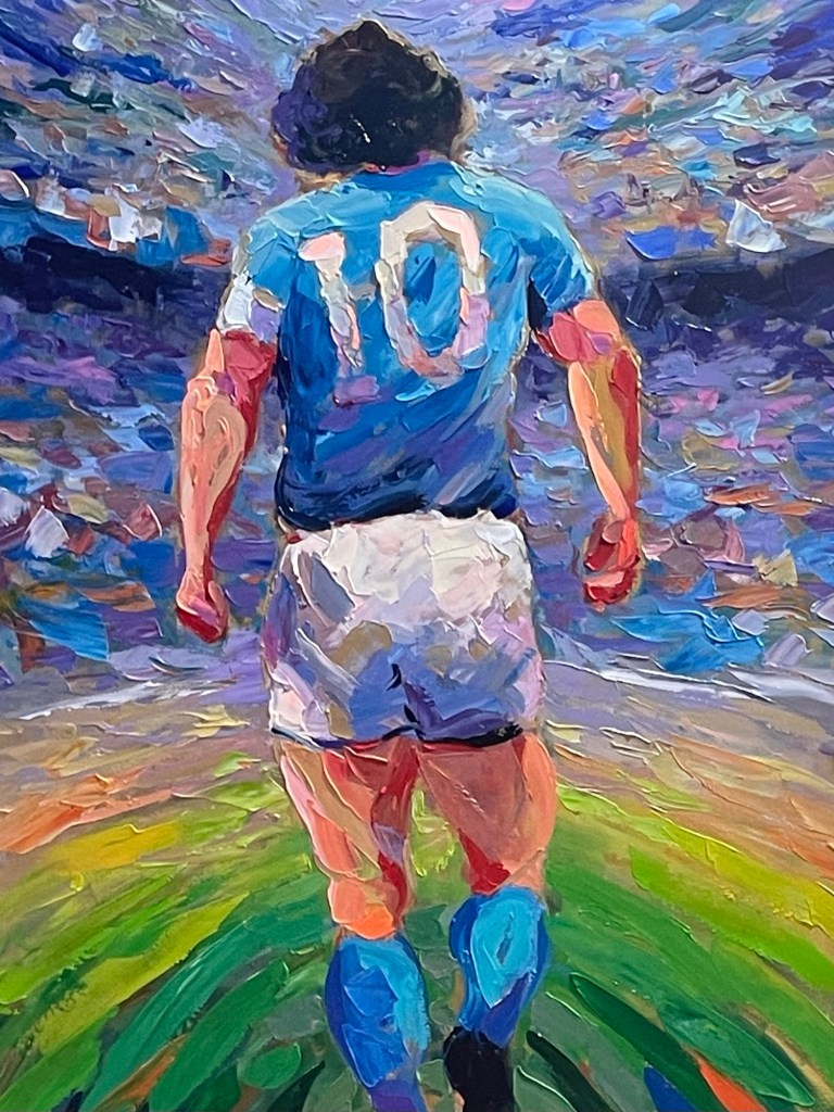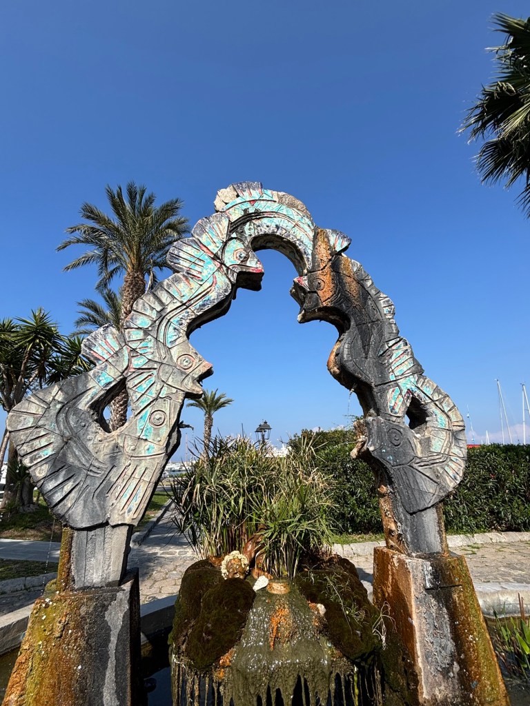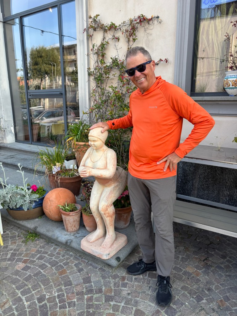Greg’s fav statue at our hotel.Pozzuoli shorelineBoats are quick to launchMiradona – everywhere – Napoli Futbol legend. Ferry to Ischia Ischia Harbor Fun Art in Ischia