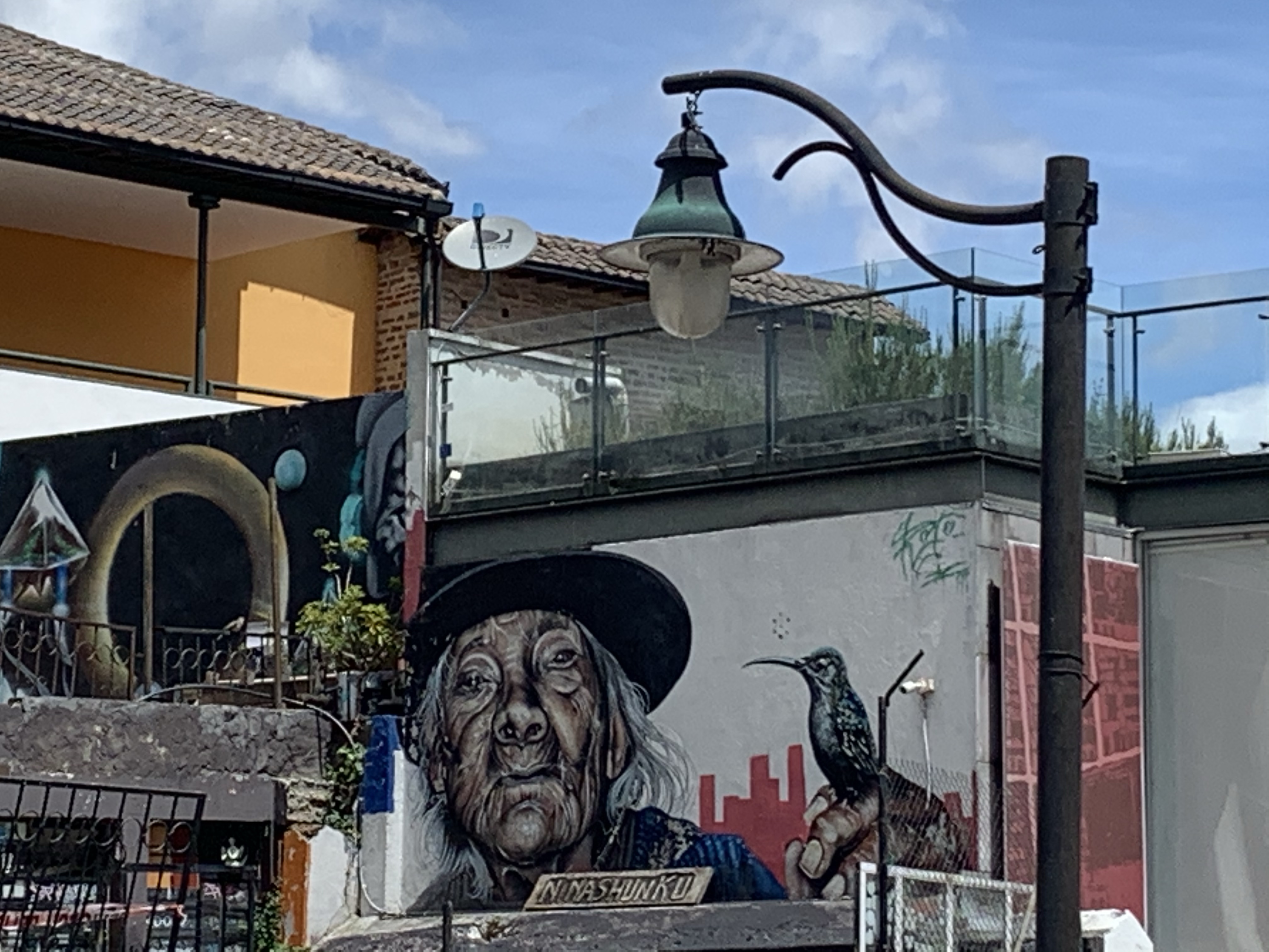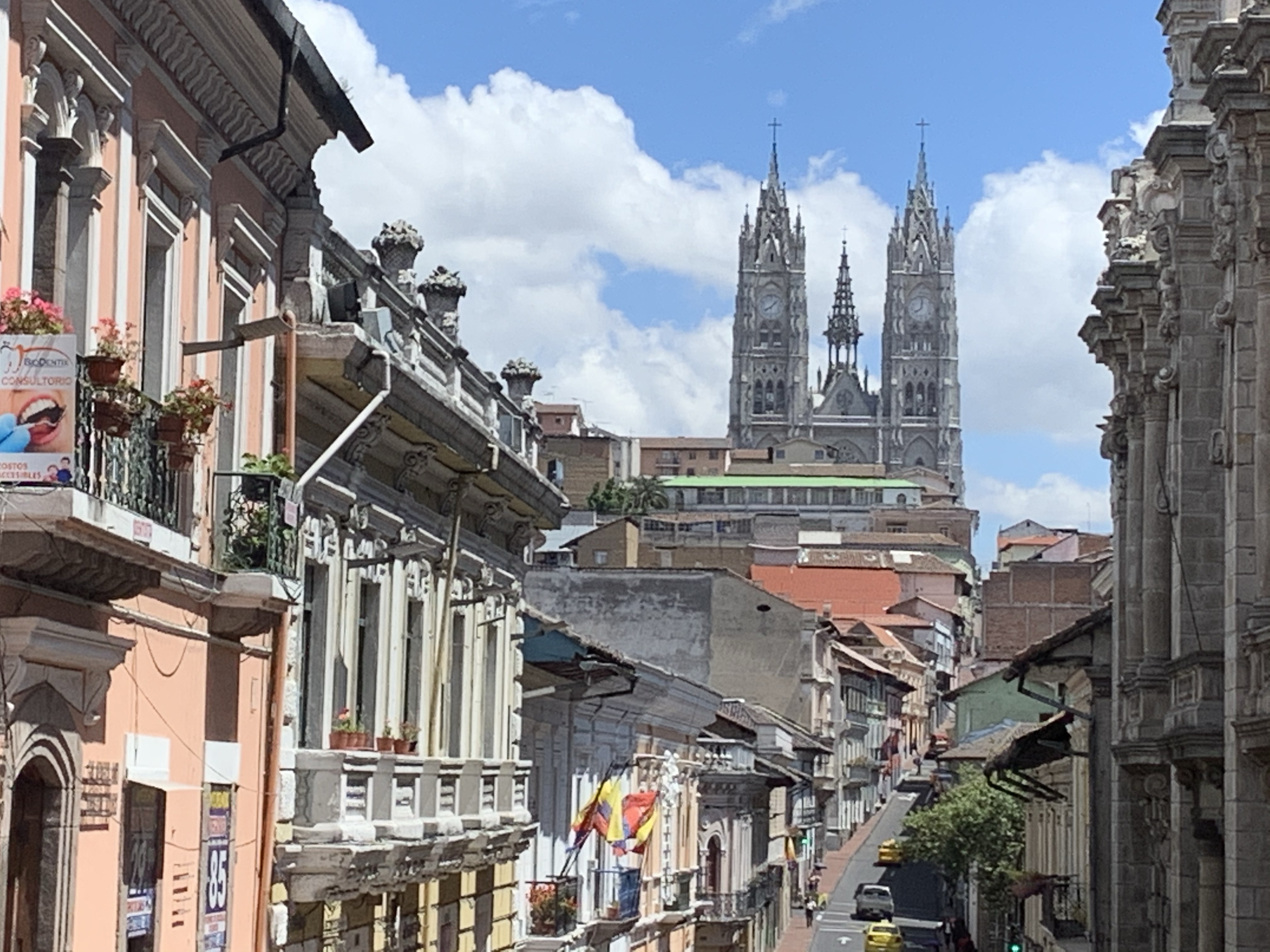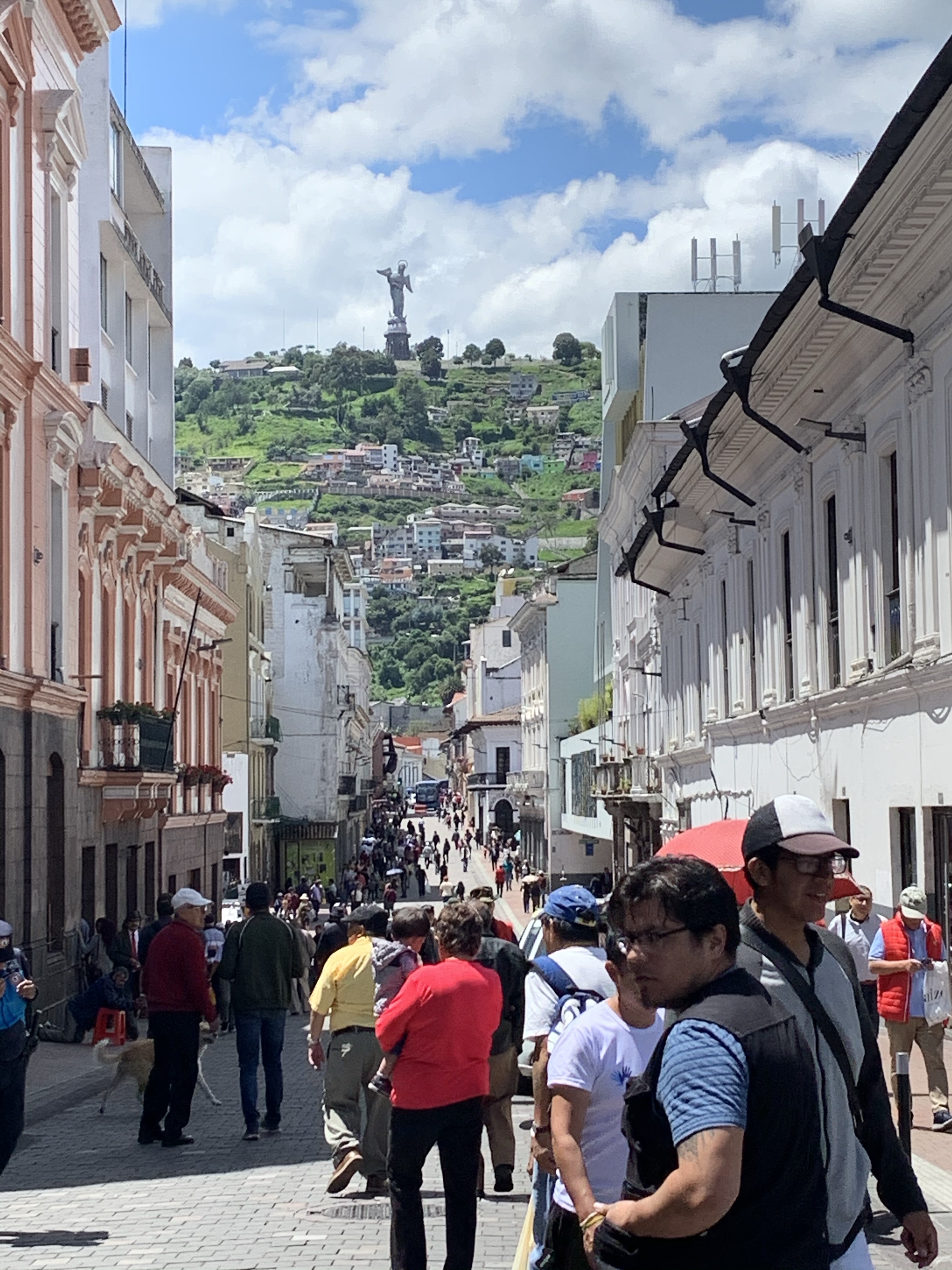 Our photo in this post shows Cotopaxi from the small lovely hacienda. The road to the hacienda was cobbled and we saw a gentleman walking g to town dressed in a suit & white shirt – finished with his dapper hat- guessing about 70 years young. our walking tour of Quito included amazing plazas, churches & government buildings.